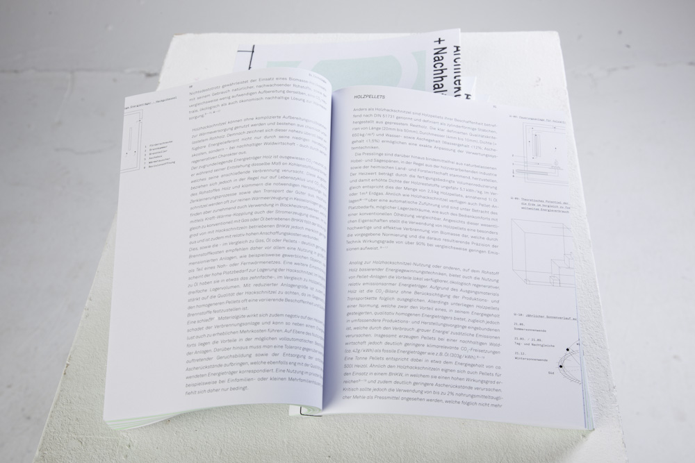 NACHHALTIGES PRODUKTDESIGNEine Arbeit zum Thema Nachhaltigkeit wird erst dann in sich schlüssig, erscheint sie nicht nur in ihrem Kern, sondern auch nach außen hin glaubwürdig. Im grafischen Gewerbe ist es in der heutigen Zeit üblich, sich viele Dinge sehr einfach zu machen. Gedruckt wird online, frei-gestellt oder produziert in Fernost, alles immer schneller und preiswerter. Leider bleibt so oftmals nicht nur die Qualität, sondern auch ein angemessenes Umweltbewusstsein auf der Strecke. Vielen Verbrauchern scheint es viel zu oft schlichtweg egal zu sein, welche ökologischen Maßstäbe die Publikation, die sie in den Händen halten berücksichtigt – etwaige Details erfahren kaum Wertschätzung. Dabei sollte der Anspruch eines jedem im Bereich der Gestaltung tätigen (unabhängig ob im Bereich Print, Digitale Medien oder wie in unserem Fall der Architektur) das Produzieren hochwertiger und qualitätsvoller Arbeiten sein, weshalb im Vorfeld einige Faktoren und Fragestellungen zu klären und zu berücksichtigen waren, um die Eingangs angesprochene Glaubwürdigkeit der Ausarbeitung zu gewährleisten. Das Thema Nachhaltigkeit sollte demnach nicht nur inhaltlich, sondern – einer holistischen Konzeption folgend – auch in der Produktion sowie bereits in der Gestaltung des Layouts erkennbar sein. Es geht dabei nicht einfach nur darum im Druck ein holzfreies Papier mit FSC-Zertifizierung zu verwenden. Gestaltung kann und muss mehr leisten um eine Arbeit innerhalb des Themenbereichs der Nachhaltigkeit auch wirklich nachhaltig umzusetzen. Das Verwenden einer sogenannten japanischen Bindung dient daher nicht nur dem Zweck einer zeitgemäßen Gestaltung, sondern bietet durch den Verzicht auf Leim- und Klebestoffe die Möglichkeit sämtliche enthaltenen Materialien – nach Ablauf des Lebenszyklus dieses Druckwerks – rückstandslos und unkompliziert voneinander zu trennen und in ihre Stoffkreisläufe zurückzuführen. Des Weiteren ermöglicht eine solche Buchbindemethode das Verwenden von dünneren Papierstärken. Die Falzung der Bögen erzeugt trotz reduzierter Materialstärken ein hohes Volumen und somit bei den Nutzern der Eindruck einer schweren haptischen Qualität. Während ein gängiges Laserdruckpapier 90-100 g/m² wiegt, ist der in dieser Arbeitet verwendete Bedruckstoff nur 60 bzw. 65 g/m2 leicht. Dadurch, dass der Falz des Druckbogens nach außen hin sichtbar ist und die offene Seite des Druckbogens im Bund verschwindet, können die Seiten über den Rand des Bogens hinaus laufen und werden so „versteckt“. Neben dem Effekt eines schönen Farbspiels im Schnitt des Buches spart dies ebenfalls Platz ein. Eine japanische Bindung ist auf vielerlei Arten zu verarbeiten. Nachdem die Bögen von Hand mit einem sogenannten Falzbein gefalzt werden, muss der Papierstapel zusammengetragen und temporär mithilfe von Maulklammern fixiert werden.