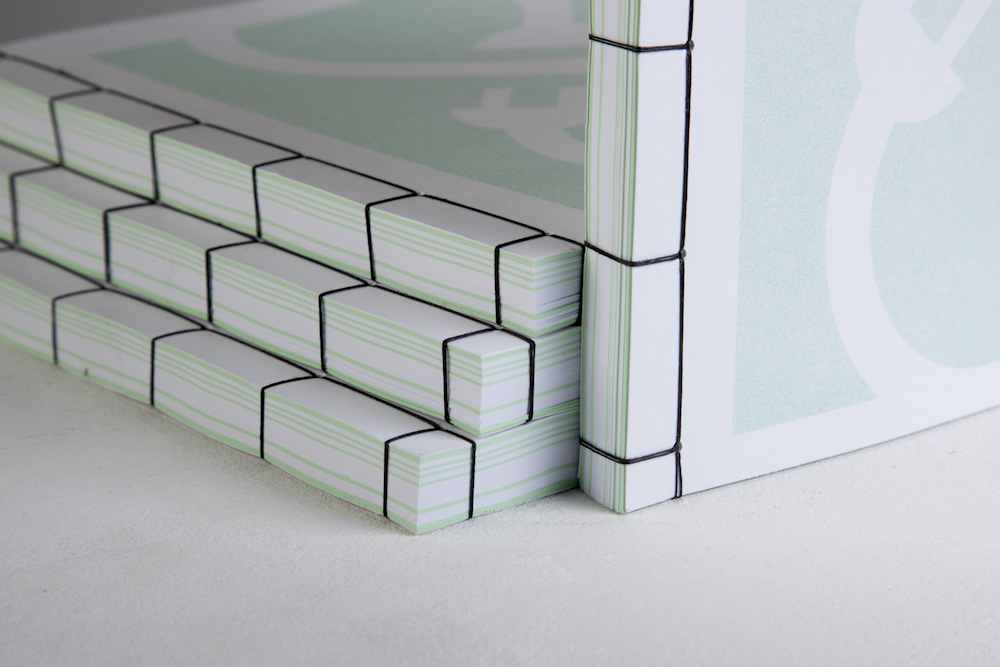 Um wie eingangs erwähnt auf den Einsatz von Klebemitteln zu verzichten, wird der Papierblock zunächst mit einer Bohrmaschine gelocht und daraufhin mit einem Faden genäht. Auf einen nachhaltigen Einsatz von Druckmitteln eingehend, spricht die stringente Verwendung von lediglich einer Farbe die klare Sprache einer angemessenen Reduktion: Werden nicht nur die Grundfarben des Vierfarbendrucks (Cyan, Magenta, Gelb und Schwarz) verwendet, müssen gewählte Farben im System der autotypischen Farbmischung miteinander kombiniert werden. Eine Sekundärfarbe – also eine Farbe, die aus 2 Grundfarben gemischt wird – wie beispielsweise Rot, wird aus Anteilen von Gelb und Magenta produziert. Tertitärfarben wie etwa Braun benötigen sogar 3 Grundfarben (Gelb, Mangenta und Schwarz). Ein Verzicht auf eine Farbigkeit im Druck bedeutet daher gleichermaßen das Einsparen eines Großteils des Farbauftrags. Um sich nicht dem Vorwurf der gestalterischen Simplizität unterwerfen zu müssen wird eine Farbigkeit einfach durch die Verwendung farbiger Papiere erzielt.